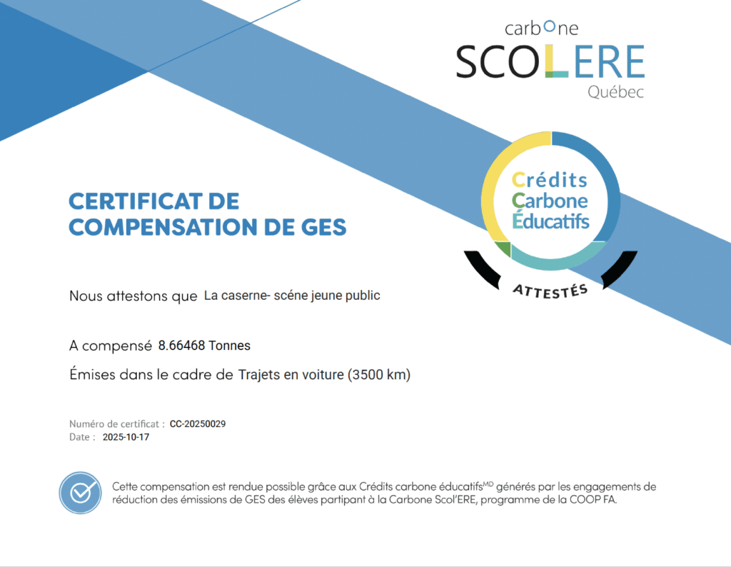 Chaque année, on compense les gaz à effet de serre produits par les déplacements (auto, taxi, avion, etc.) des membres de notre équipe et des compagnies de production d’ici jusqu’à l’international. On travaille à compenser nos GES en collaboration avec Carbone Scol’ERE Québec, un programme éducatif de sensibilisation aux enjeux environnementaux dans les écoles qui soutient la compensation carbone.